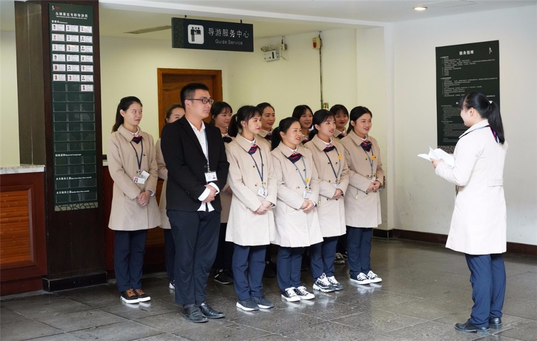節前備戰篇,票務中心集體培訓黃金周指導原則及注意事項,做好突發狀況和應急措施的落實,以及安排各點位人員及主要負責人落實接待方案,總結歷年來的問題并提出解決方案 提高窗口輪換率,確保票款的安全;接待導游板塊進行了黃金周節前動員大會,再次明確熟悉各種安全應急通道及景區多條疏散路線,演習安全事故應急處理情景,排練相應民俗節慶文藝節目等,以確保游客安全舒適游玩;大前臺和預訂中心也開展了游客高峰期提高服務效率等一系列對應的培訓及演練,崗員們用實際行動告訴八方來客,我們準備好了!