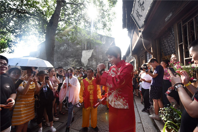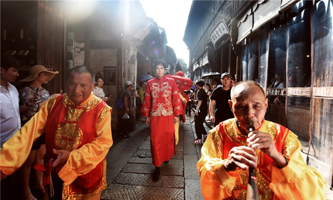一路吹打,新人花轎沿著西柵老街一直行進(jìn)到沈家戲園,三拜后禮成,當(dāng)天所有現(xiàn)場的游客都是他們愛情開花結(jié)果的見證。