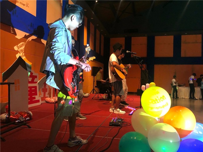 烏村本土紅青蛙樂隊上場,彈唱《夜空中最亮的星》等歌曲,游戲互動歌曲猜猜猜環(huán)節(jié),家長們紛紛一展歌喉,與樂隊主唱同臺競技。