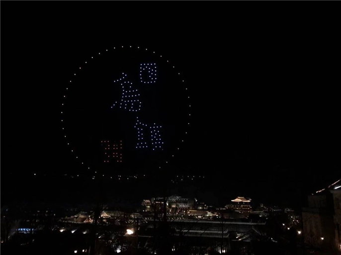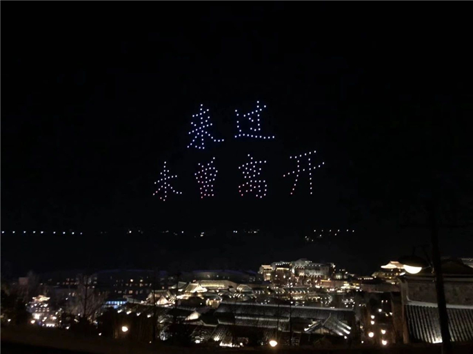 古北夜空中的無人機秀也在上演,數百架無人機懸空組成“烏鎮”、“來過 未曾離開”、“烏鎮古北一家親”等字樣,陣勢浩大,精彩紛呈。