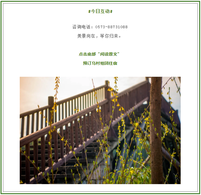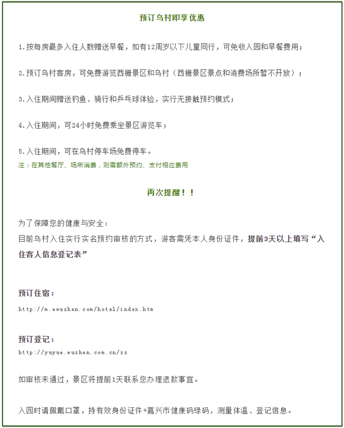 為做好景區疫情防控,保障游客以及工作人員的健康,烏村入住實行實名預約審核制度。