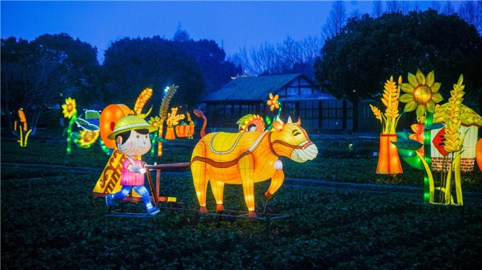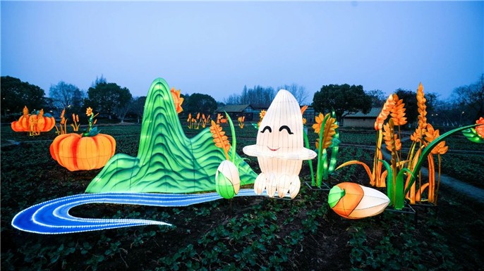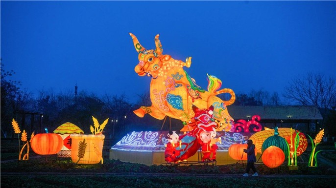 西柵景區月老廟處,以繡樓為主題的燈組,融入了古代拋繡球的靈感,與夜色中的月老廟相得益彰。燈影晃動,男女相逢,最是適合相遇和相識的時候,更是讓元宵節被蒙上了一層浪漫的色彩。