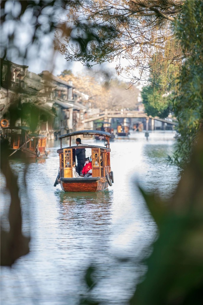 初春時節風和日麗,泛舟漫游賞景,是再愜意不過的休閑方式了。兩岸的木質水閣,倒映在河道中,任船槳聲聲“咿牙欸乃”,攪亂陣陣漣漪。