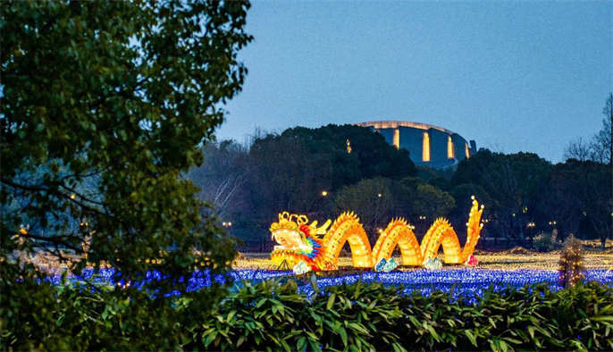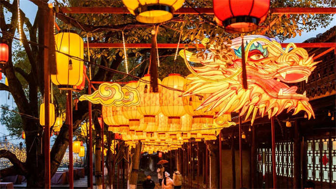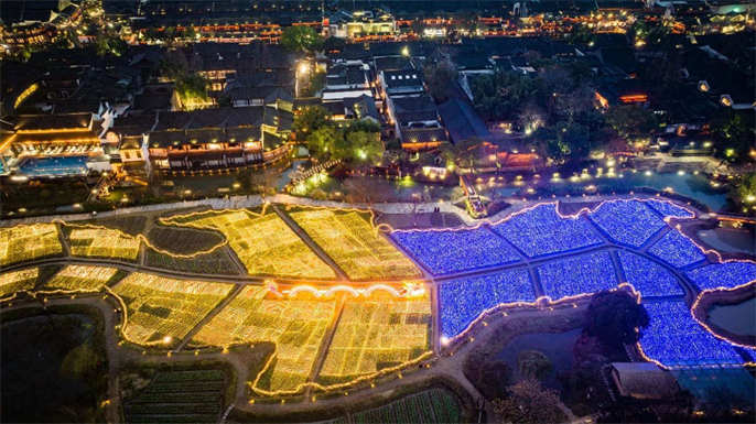 在烏鎮龍形田,一條長40米的金龍花燈盤桓其中,在星光點點的珠燈掩映之下,猶如“山海游龍”。從上空俯瞰,與龍形田相映成趣,“雙龍迎春”喜氣滿滿。