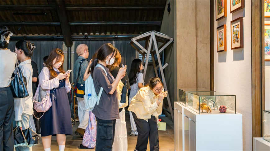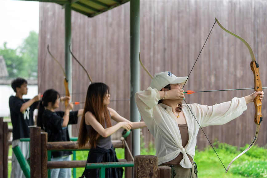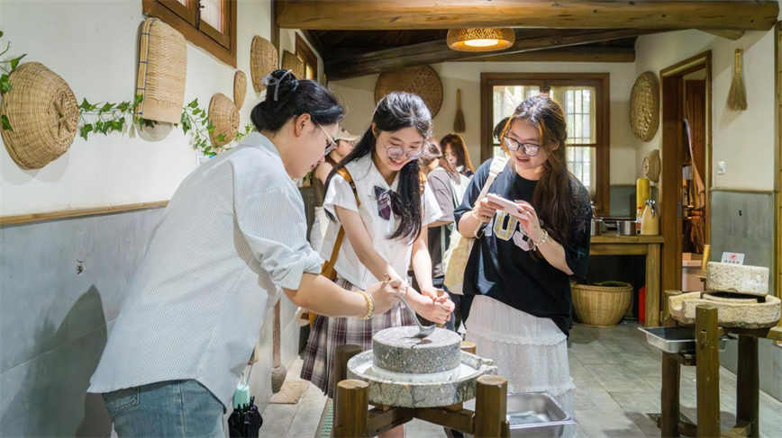烏村留存的上世紀七八十年代的屋舍和景觀都十分吸引這批年輕訪客,城市里未曾見過的水車和石磨,路邊休憩的水牛,田里栽種的圓形茄子和甘蔗等農作物……讓他們感受到了質樸與自然的魅力。逃離城市燥熱的空氣,來烏村近距離接觸大自然,領略生機勃勃的動人風景,為他們的專業實踐提供了新的靈感。大學生記者們還體驗了射箭、坐小火車、手磨豆漿、石磨豆腐活動,用相機記錄游玩體驗,并計劃在自媒體賬號上分享在烏村的所見所感。