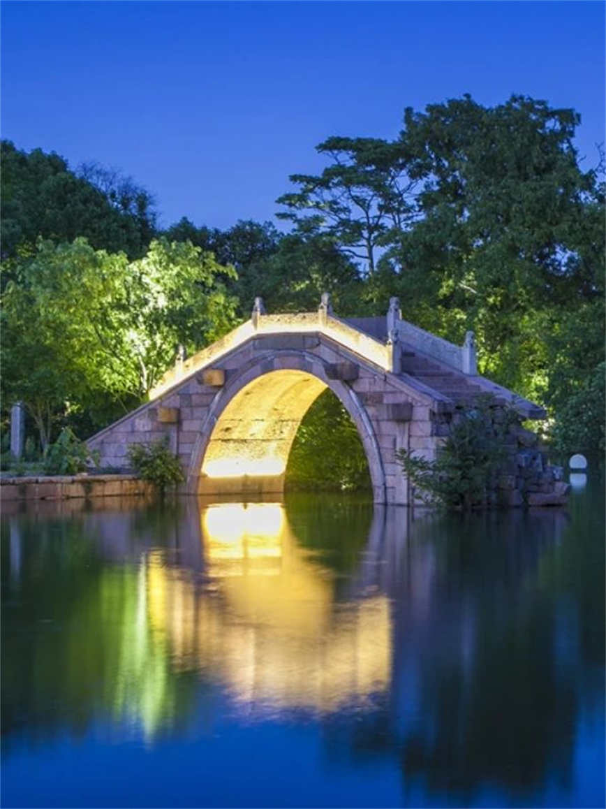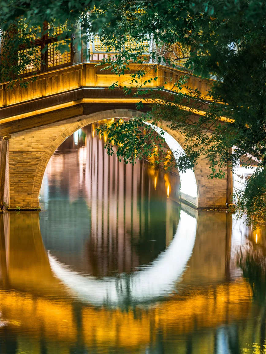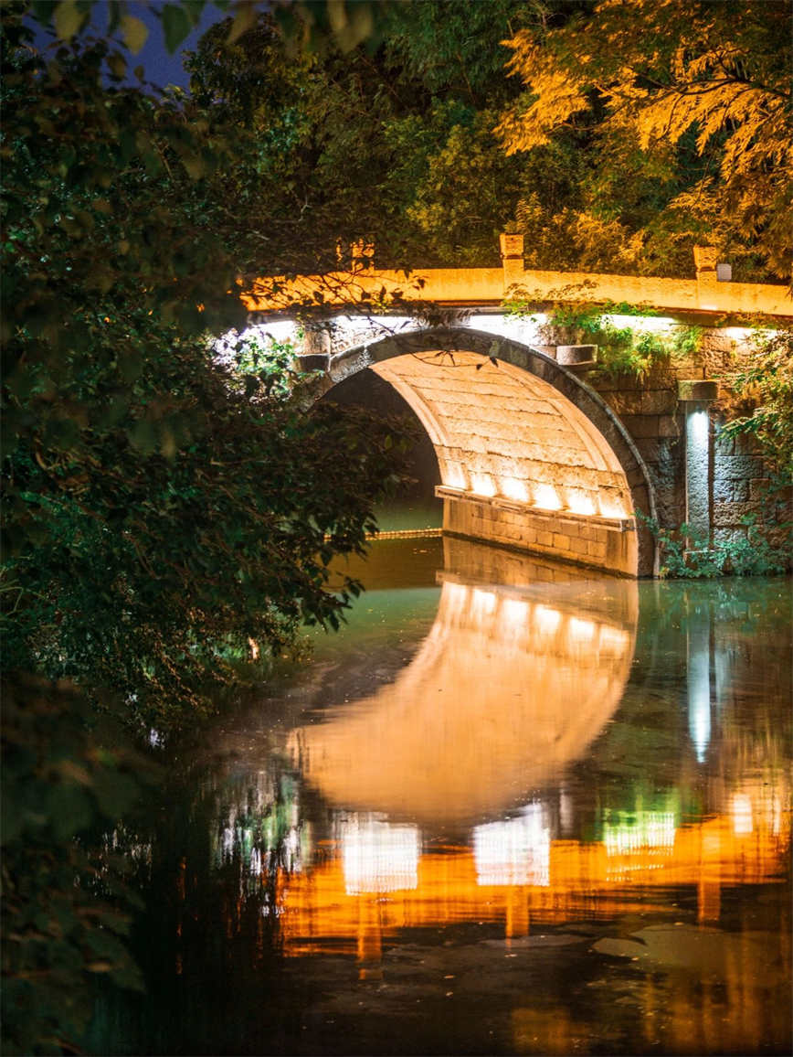 每當夜幕降臨,橋上的燈光倒映在水面,形成了溫柔而又浪漫的月亮橋,從不同的角度,倒映的月相也不盡相同,橋韻起承轉合,月相陰晴圓缺,對應了月亮橋倒影的多樣變化。