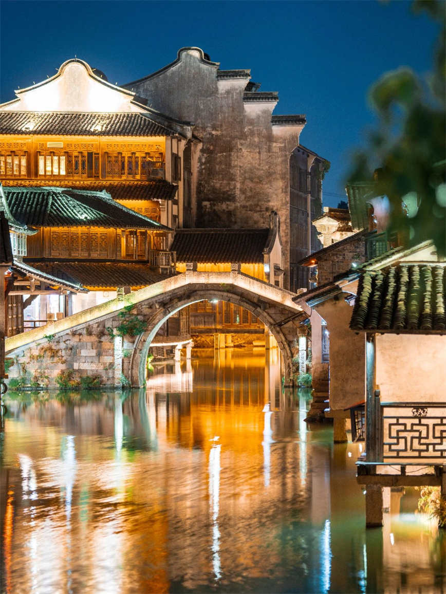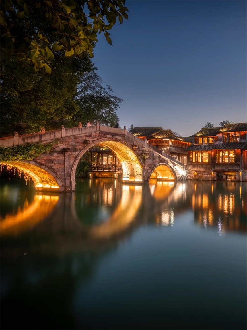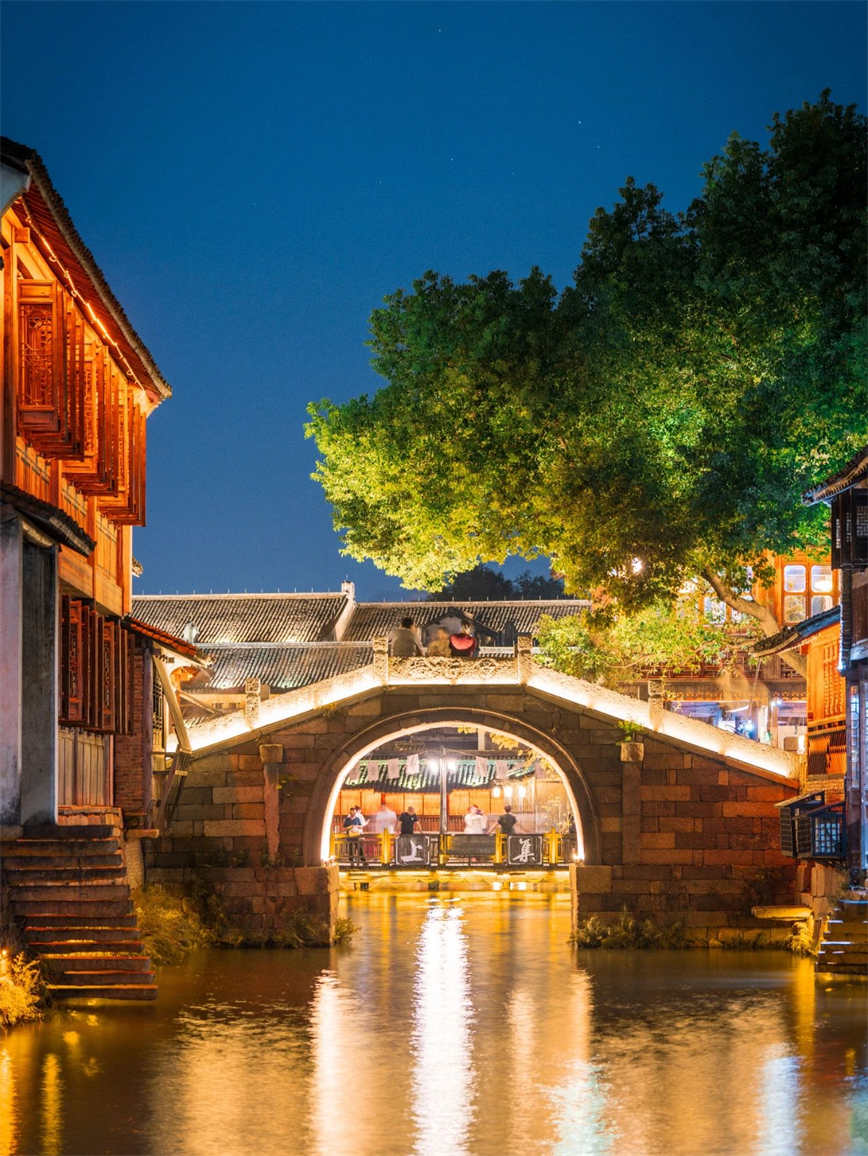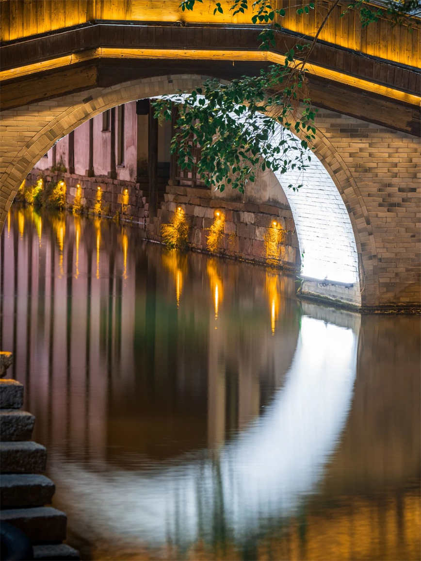 每當夜幕降臨,橋上的燈光倒映在水面,形成了溫柔而又浪漫的月亮橋,從不同的角度,倒映的月相也不盡相同,橋韻起承轉合,月相陰晴圓缺,對應了月亮橋倒影的多樣變化。