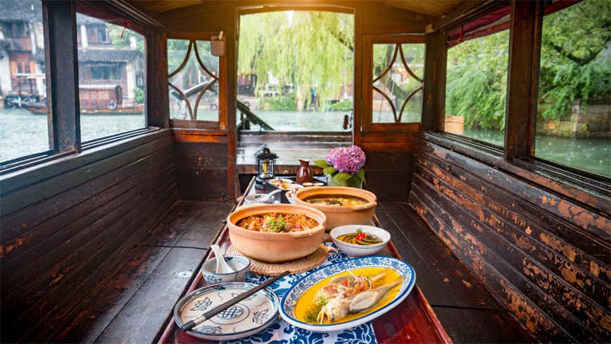 端午時(shí)節(jié),民間向有“吃五黃,避五毒”的習(xí)俗。烏鎮(zhèn)推出端午限定 “五黃宴”,咸鴨蛋、拌黃瓜、咸肉黃鱔鍋、清蒸黃魚(yú)、臭鹵南瓜與話(huà)梅黃酒齊聚一桌,黃澄澄的色彩既應(yīng)和著端午“吃五黃”的傳統(tǒng),更承載著祛病納福的美好祈愿。