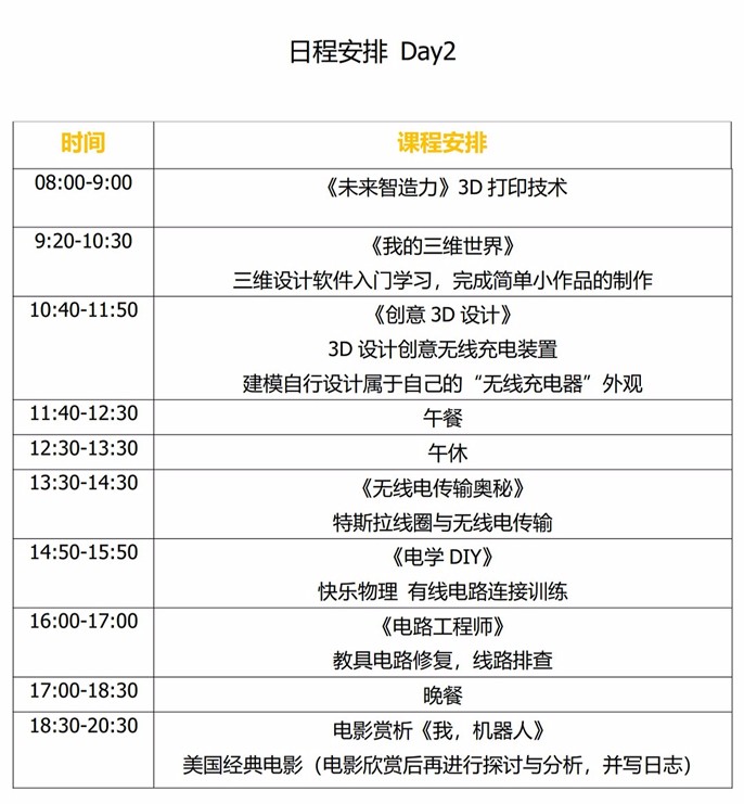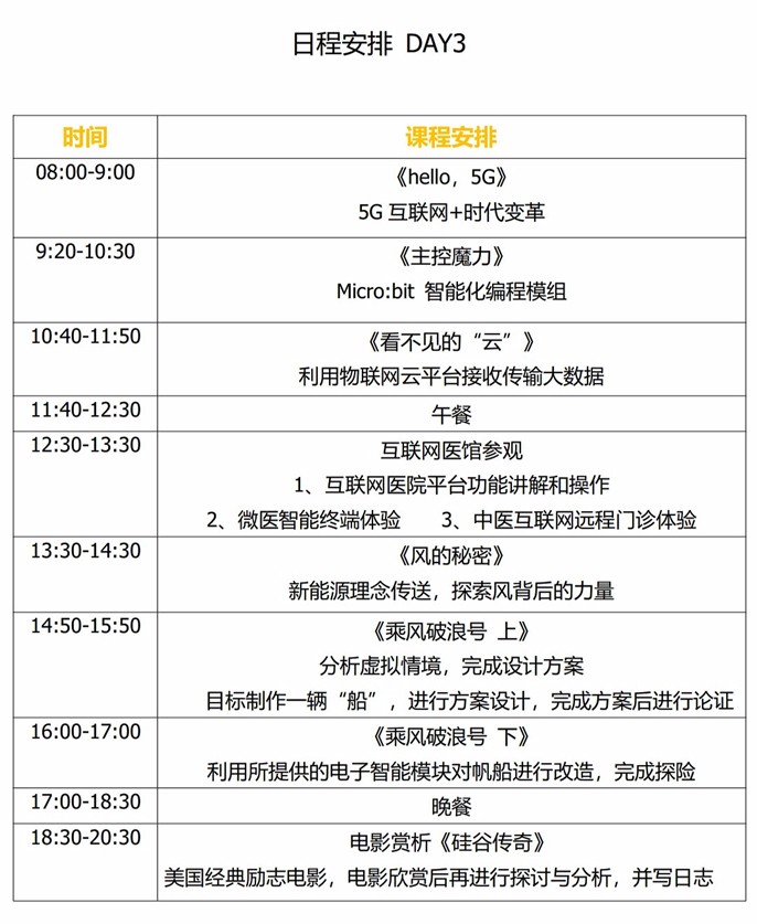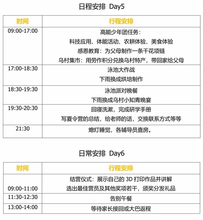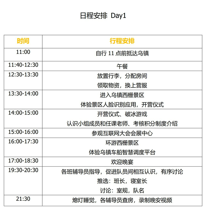 參觀世界互聯網大會會展中心、閉營成果展示、巡游西柵、歡迎晚宴、木心美術館、晚間電影、完成研學手冊、烏村定向越野、烏村手工活動、泳池派對晚餐……