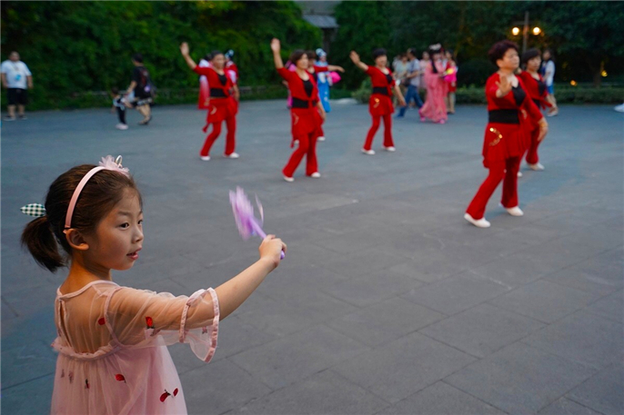 風(fēng)靡大江南北的廣場舞出現(xiàn)在烏鎮(zhèn)西柵市民角,阿姨叔叔們熱情飽滿,在廣場上翩翩起舞,連帶著小朋友也躍躍欲試。