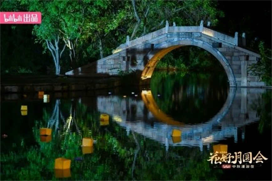 每當夜幕降臨,橋上的燈光倒映在水面,形成了溫柔而又浪漫的月亮橋,從不同的角度,倒映的月相也不盡相同,橋韻起承轉合,月相陰晴圓缺,對應了月亮橋倒影的多樣變化。