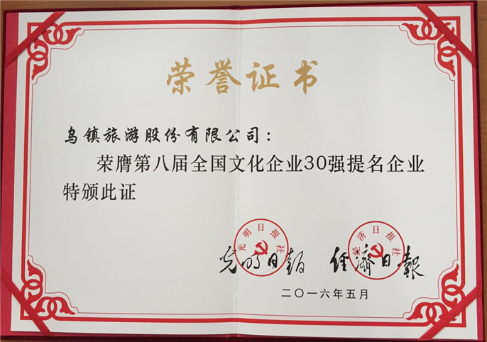 5月12日,烏鎮(zhèn)旅業(yè)在中宣部召開(kāi)的“以新發(fā)展理念引領(lǐng)文化改革發(fā)展”座談會(huì)上,榮獲“第八屆中國(guó)文化企業(yè)30強(qiáng)提名企業(yè)”,烏鎮(zhèn)旅游股份有限公司總裁陳向宏出席座談并現(xiàn)場(chǎng)領(lǐng)獎(jiǎng)。