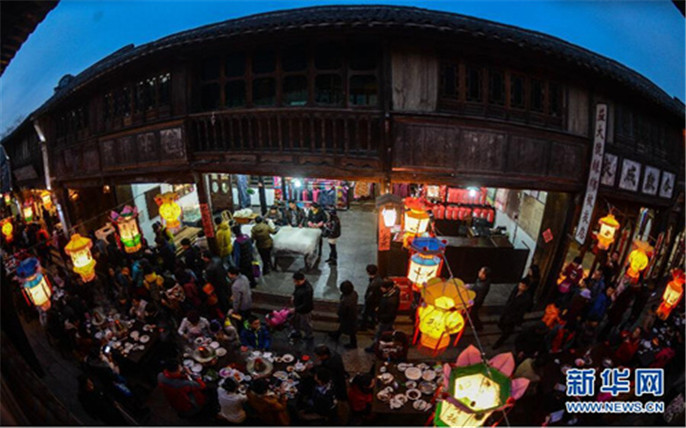 新華網訊 2月19日,來自各地的游客在烏鎮西柵景區的“長街宴”上享受美食。