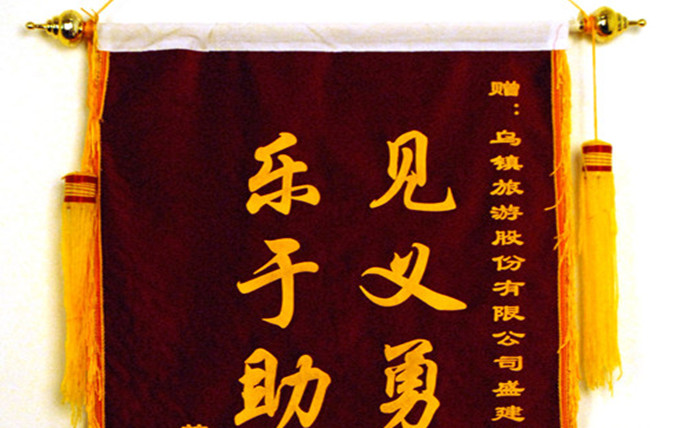 ?4月27日下午,烏鎮景區員工盛建新收到兩份特殊的禮物——一份“海報”和一面錦旗,表達了游客祝月花及她的丈夫對其樂于助人行為的感激之情!