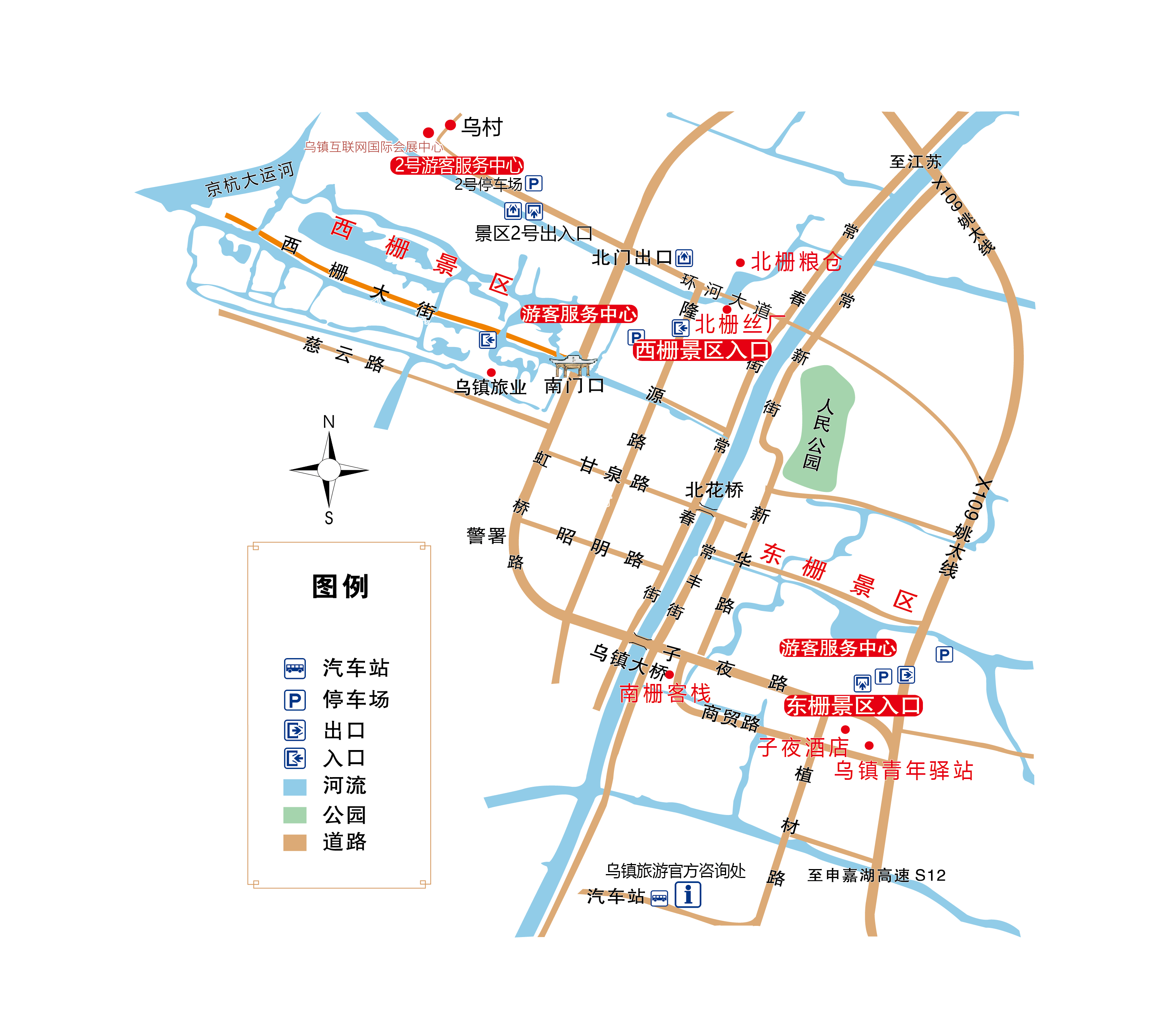 烏鎮車站——植材路——子夜路——虹橋路——西柵景區——虹橋路——子夜路——植材路——烏鎮車站。