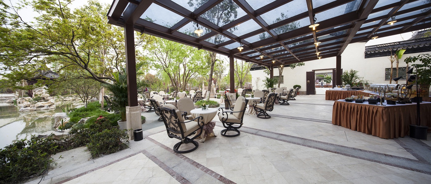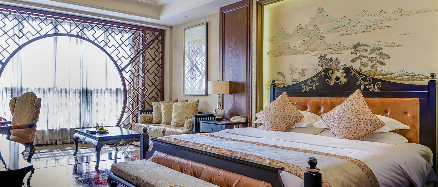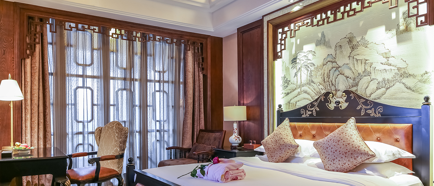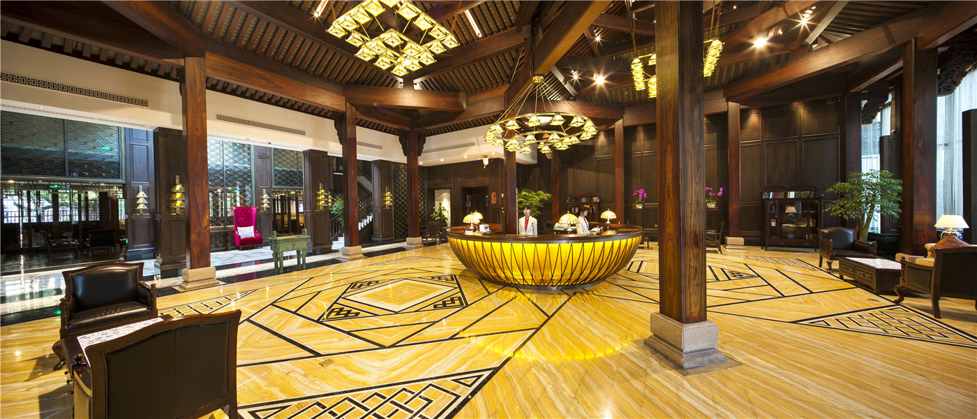 南臨翡翠漾,背靠古老的京杭運河。酒店大堂采用中國傳統的“雙亭式”建筑結構,大堂整體構造木料、立柱、大梁均采用上等珍貴紅木,榫卯環扣,斗形天穹,為國內罕見的“紅木大堂”